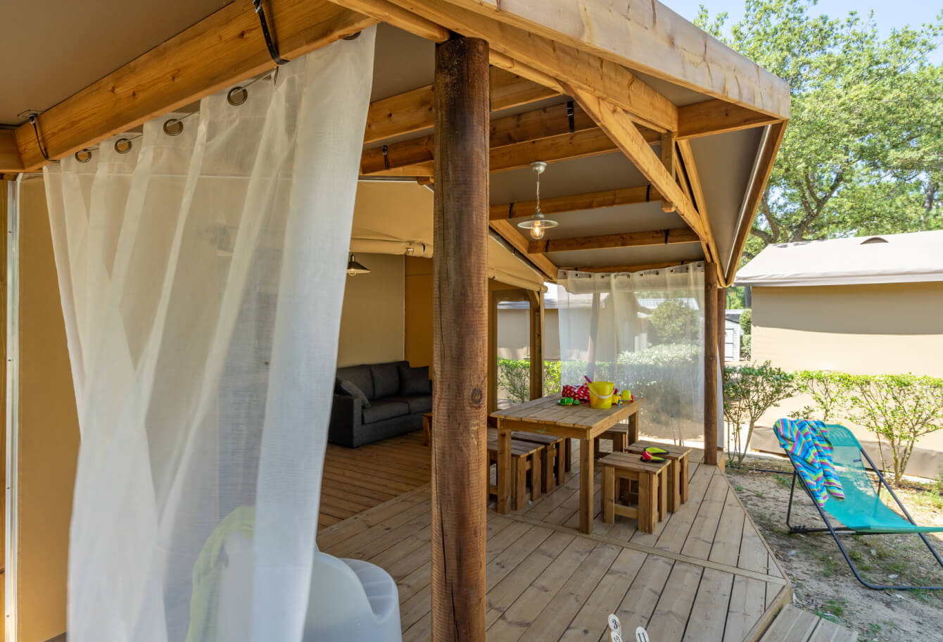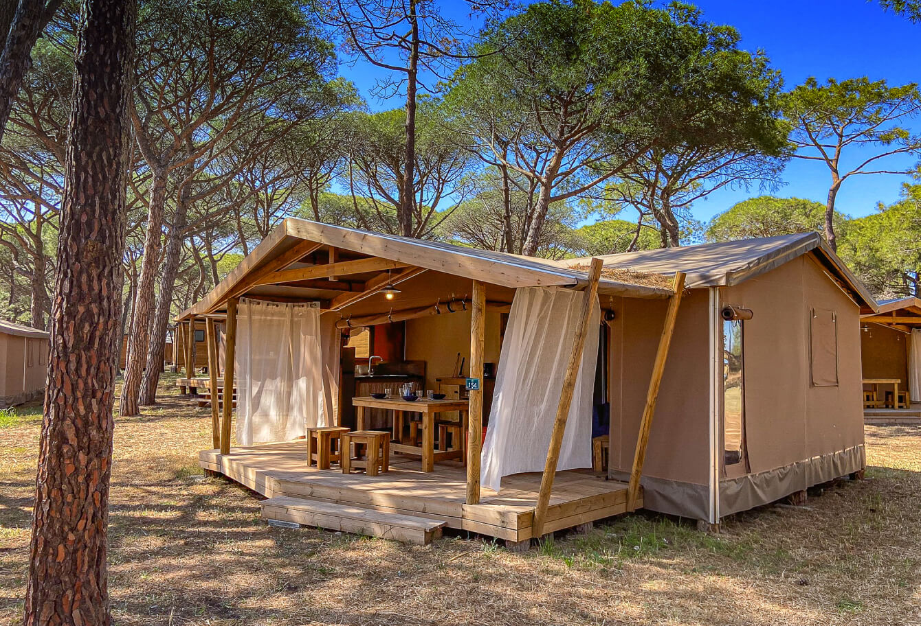 Kleine und große Abenteurer werden diese halb Zelt, halb Holz Kokons zu schätzen wissen, die harmonisch gestaltet sind und zwei Schlafzimmer, ein gemütliches Wohnzimmer mit Essbereich, eine voll ausgestattete Küche und ein Badezimmer mit WC umfassen. Die überdachte Terrasse lädt Sie ein, die Schönheit des Pinienwaldes in aller Ruhe zu genießen. Ob mit der Familie, dem Partner oder Freunden, ein authentisches und einzigartiges Erlebnis ist garantiert!